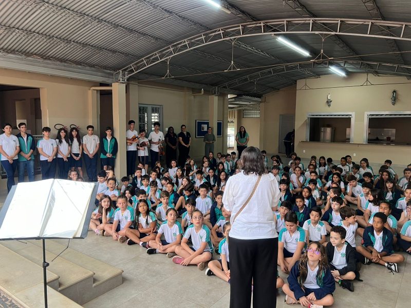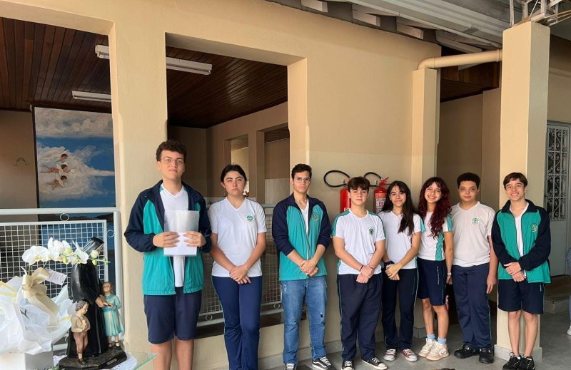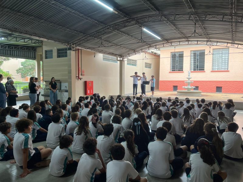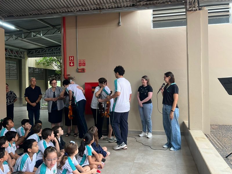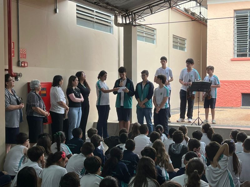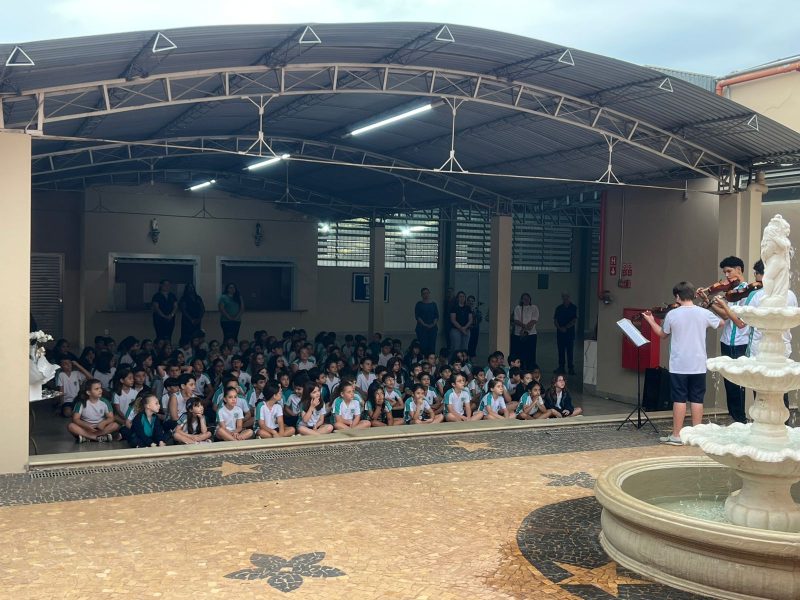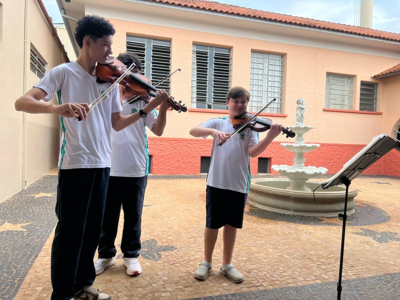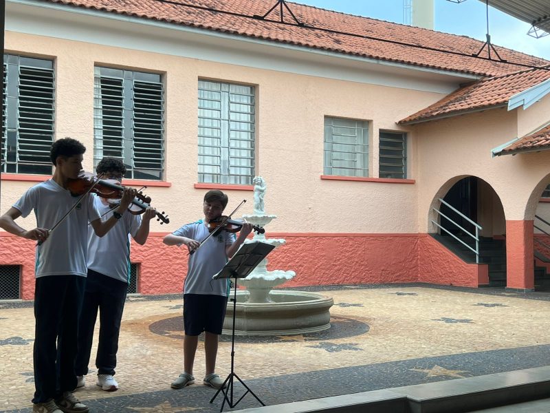 As Irmãs receberam uma singela, porém muito carinhosa, homenagem, na Fonte do Jubileu, e foram acolhidas com uma apresentação musical com violinos, feita pelos alunos Lincon Caom (1ª série A), José Gabriel Reina da Conceição (9º ano A) e Ruan Leal dos Santos (9º ano A) em nome de toda nossa gratidão pelo “sim” que deram ao chamado vocacional de perpetuar o carisma doroteano em nosso meio, pela via do coração e do amor.